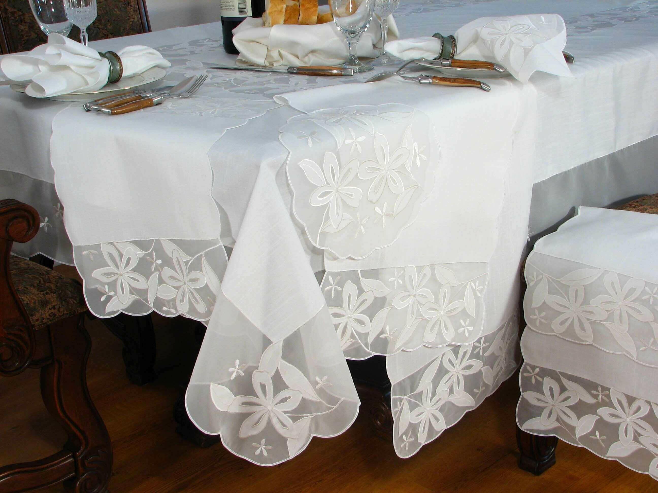 Elegant flower embroidery with hand rendered cutwork, give a spring garden feel, add beauty and elegance to any setting!