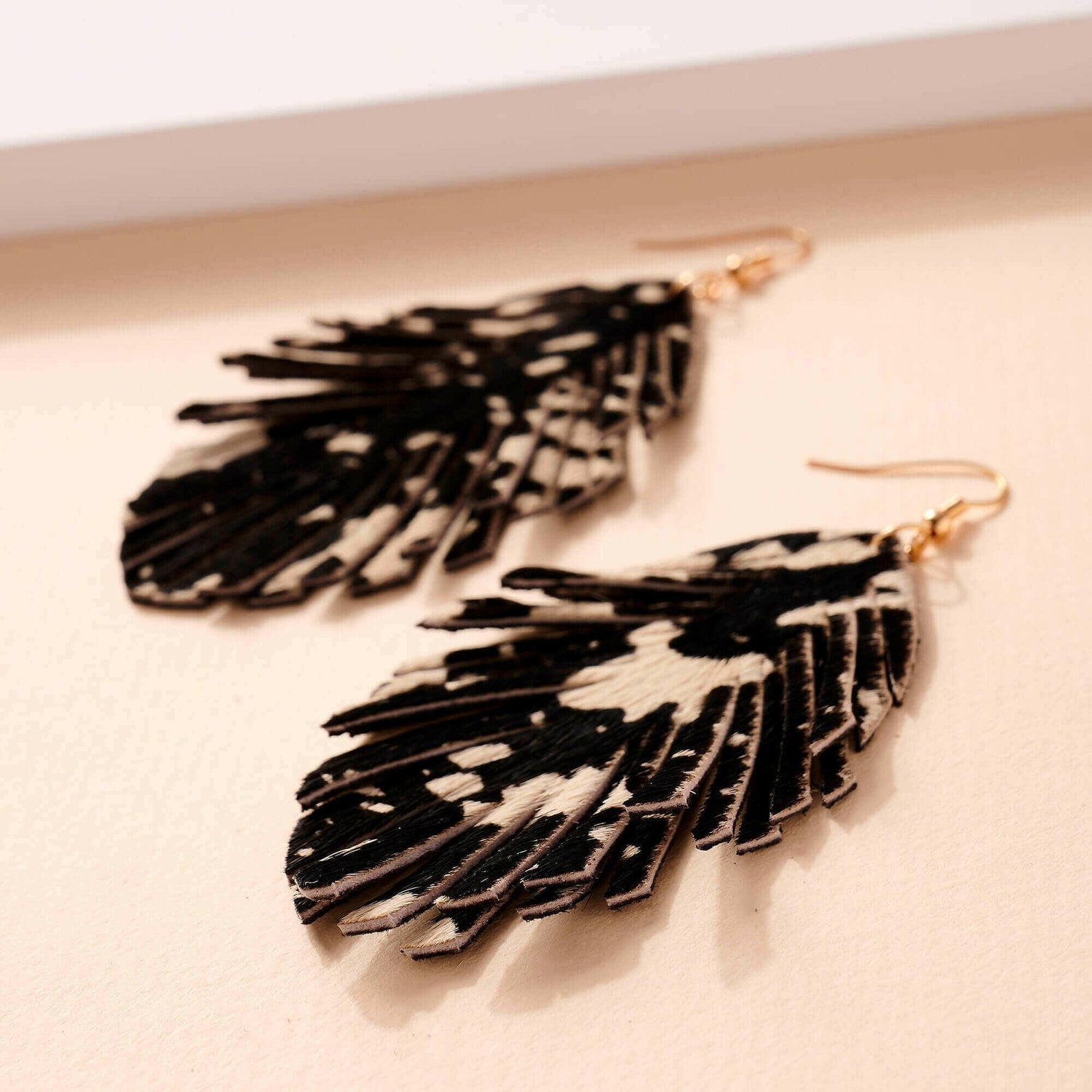 Indulge in the wild elegance of our animal print feather dangling earrings. Crafted from zinc, brass, gold plated accents, calf hair, and genuine leather, these earrings are a statement piece that exudes luxury and uniqueness.