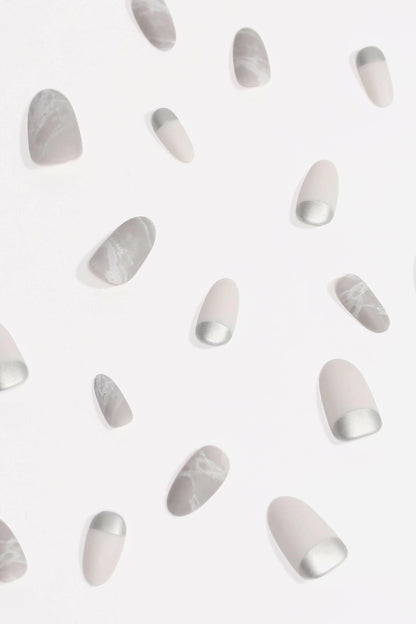 Indulge in the beauty of our Grace press-on nails, designed to offer a sophisticated marble pattern with a chic matte finish. The whispering grey tones encapsulate timeless elegance, perfect for those seeking a refined and tranquil look.