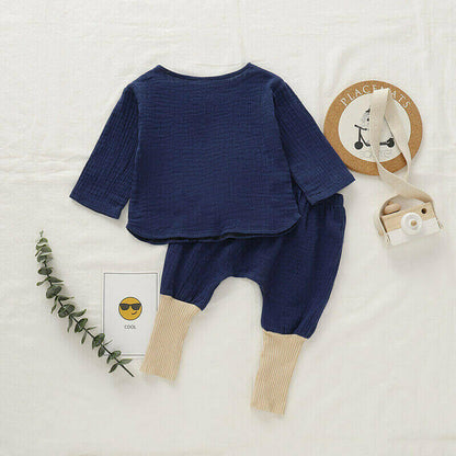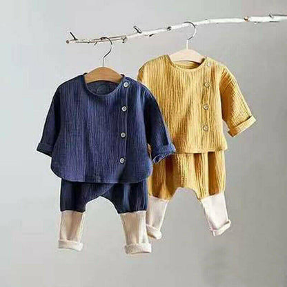 This adorable loose-fitting cotton blend set is as comfortable as it gets for fun days of playing and all-around good times. with buttons on the front for easy wear, it also has stretchy bottoms for maximum comfort. Available in Navy and Mustard, their bohemian look is irresistible, and their utility, undeniable.