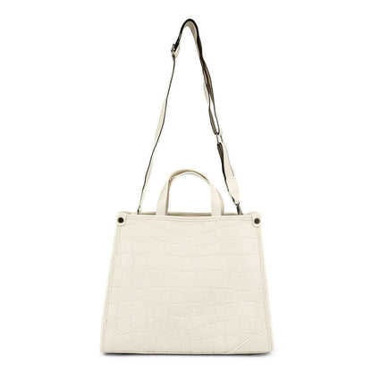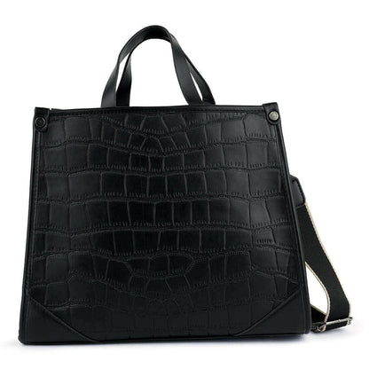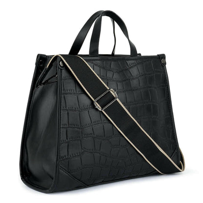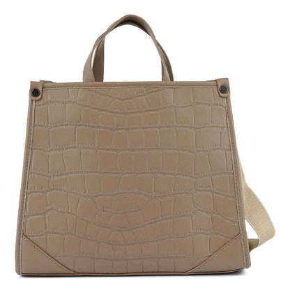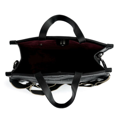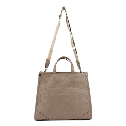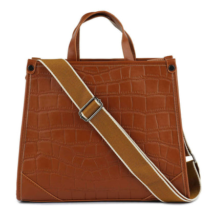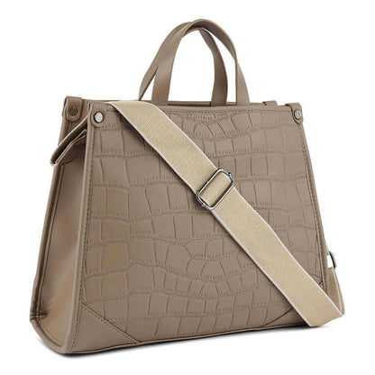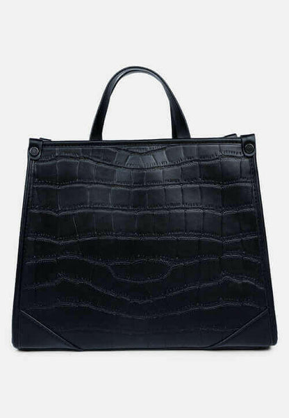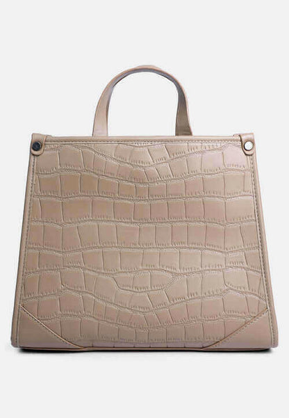 Croc Textured Trapezium-shaped solid structure handbag looks elan and carries all basic stuff. It comes with detachable and adjustable long straps. It has a short sturdy handle. The four pegs at the bottom support your bag and keep it away from scratchy surfaces.