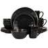 Add a beautiful accent to your dining table with the Elama George 16 Piece Round Stoneware Dinnerware Set in sophisticated Matte Black with Gold Rim Trim. Each dish is creatively crafted with a unique textured, uneven dimple design and beautifully finished off with an elegant gold rim. Constructed of Stoneware, this set is ideal for special occasion gatherings and sturdy for every day use. Each dish is microwave safe for quick reheating and dishwasher safe for easy cleaning.