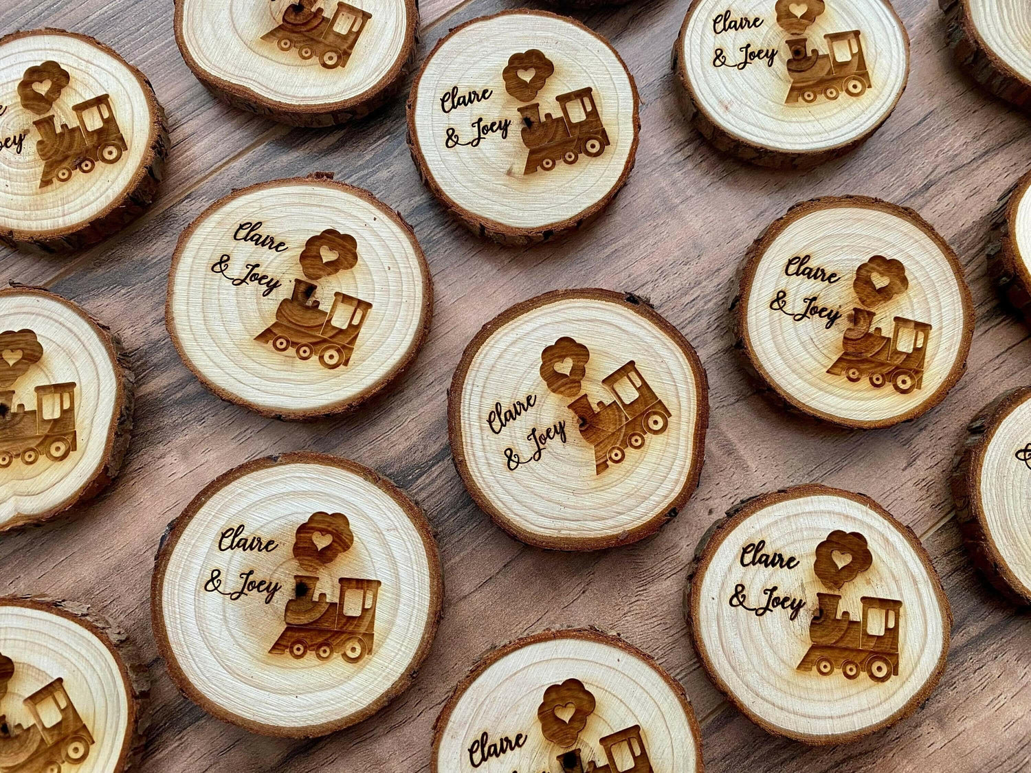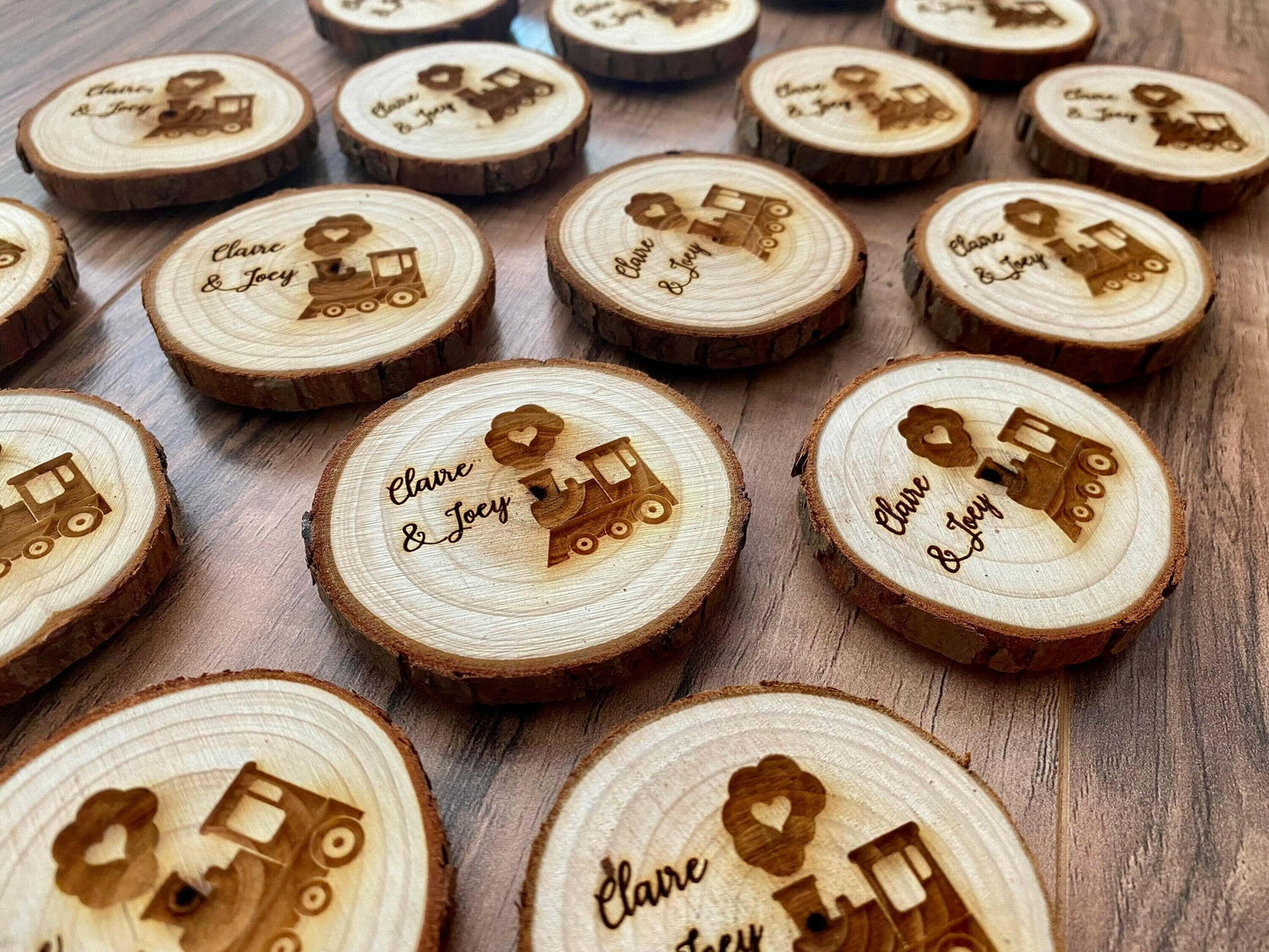 • Each wood slice is uniquely engraved with a delightful train image and custom names or a message of your choice, adding a personalized touch.