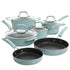 Bring out robust flavors to the kitchen with the Kenmore Elite Andover 10 Piece Nonstick Aluminum Cookware Set in Glacier Blue. The heavy gauge aluminum set provides even heat distribution for accurate cooking. Fret no more with the scratch resistant Teflon 3 layered nonstick interior, allowing for less use for oils or fats. The BPA free silicone handles stay cool to the touch during the heated cooking process. These cooking pots and pans give chefs the power to create a variety of meals such as filet mignon, vegetable soup, seared chicken, and much more!