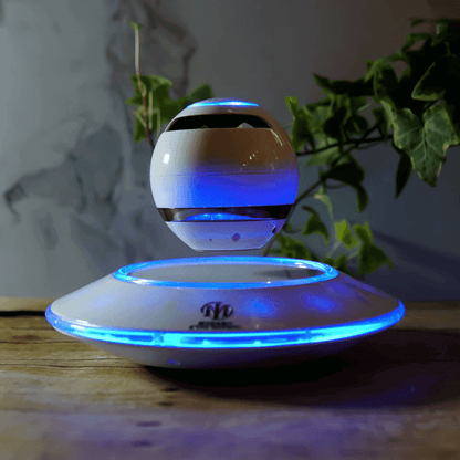 Introducing the Levitating Bluetooth Speakers, available in black and white. This speaker is designed to spin above a magnetic base, according to the anti-gravity principle. It offers 3D surround sound, with a special sound guide cone coupled with levitation for distortion-free timbre.