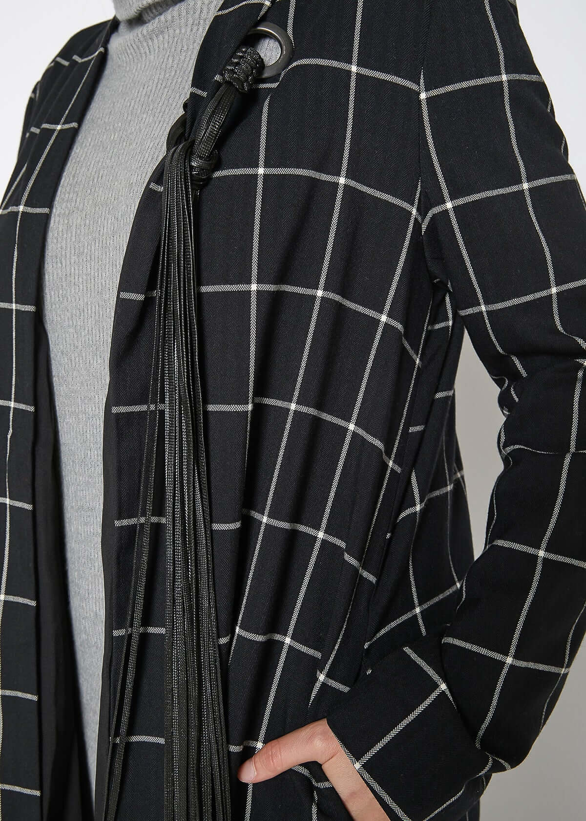 Elevate your style with our Women's Minimalist Grid Longline Coat in sleek black. This beautiful piece is designed for the modern woman who appreciates simplicity paired with sophistication.