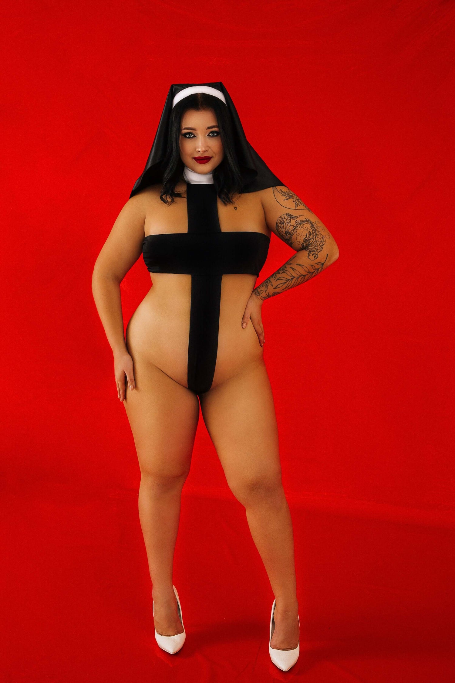 Experience the daring allure of this unique Whitney Nun Cosplay Cross Lingerie. This provocative nun costume is ideal for an enticing and exciting roleplay experience. The ensemble includes a bold black cross-design bodysuit, offering a daringly bare reveal. Accented with a white clerical collar, this bodysuit brings a risqué touch to the traditional.