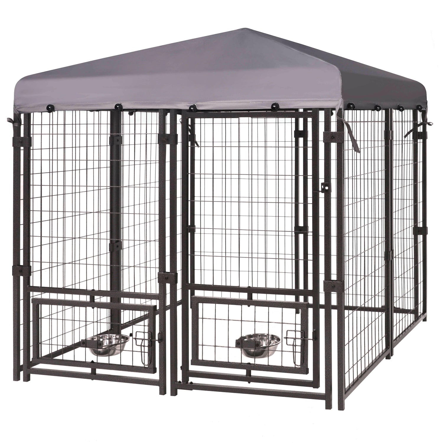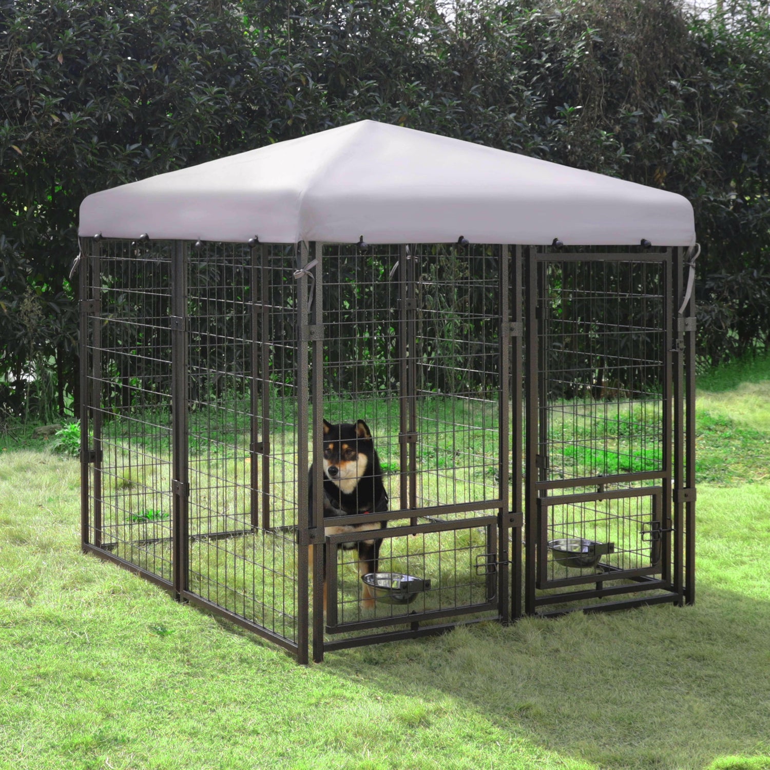 We are proud to introduce this outdoor large dog kennel, a terrific method to provide ample space for your pets. VEIKOUS dog house can make your pet rest and play in a friendly and safe environment. This dog crates is crafted from textured non-toxic power-coated welded steel frame and weather-proof coating canopy. These fence of dog cage are designed to resist UV rays, water and rust. Dual rotating doors can feed your pet conveniently, while keeping your pet safely indoors. This metal outside dog cage with lockable door to prevent your pet from predators and other dangers while outdoors, and is suitable for most small and medium-sized animals, including dogs, cats and chickens. The doors can only be pulled out but not pushed inward, meaning that the food bowls on the doors are prevented from tipping over during the pushing and pulling process. Rest assured settle your dog in the comfortable and safe kennel and enjoy your leisure time.