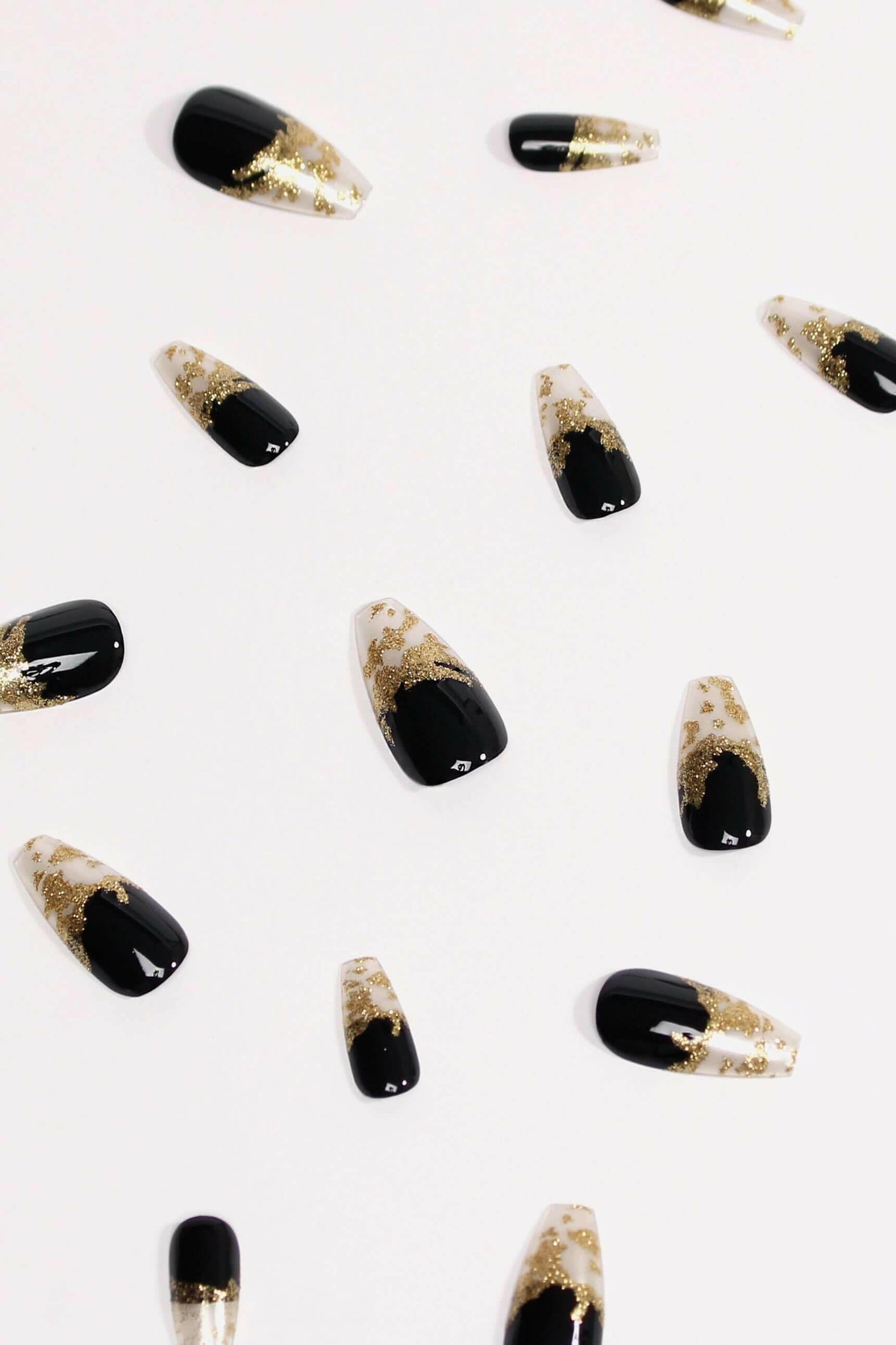 Step into the spotlight with Party Sparkle press-on nails, designed with a bold black base that dramatically meets golden flakes, evoking the glamour of a masquerade ball. This luxurious contrast is perfect for any celebration where you want your style to shine as bright as the occasion.
