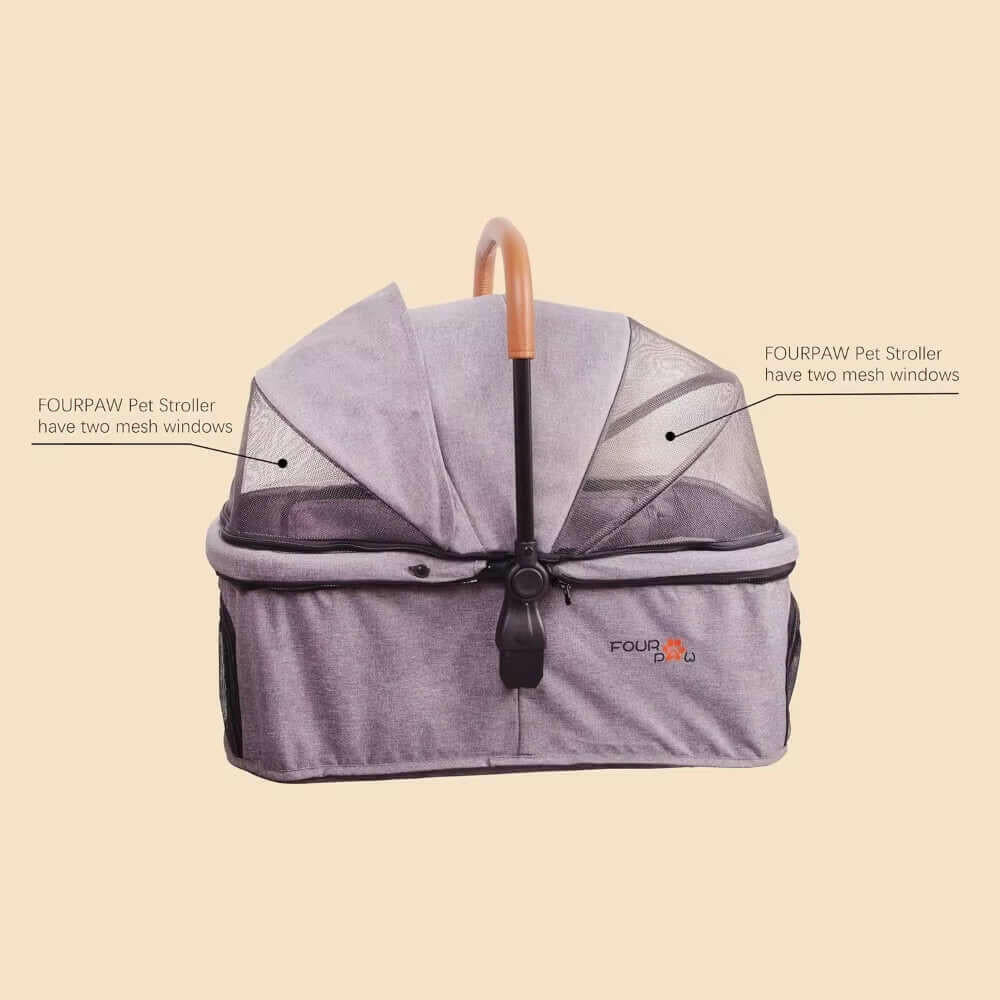 Reliable construction and high-quality craftsmanship: Our stroller is made of 600D linen fabric, which is waterproof and durable. The high-strength nylon mesh provides a sturdy and breathable outer shell with two mesh windows, allowing them to stay in touch with the outside world while maintaining close contact. The leather handle adds a touch of delicacy while enhancing the comfort for you and your pet.