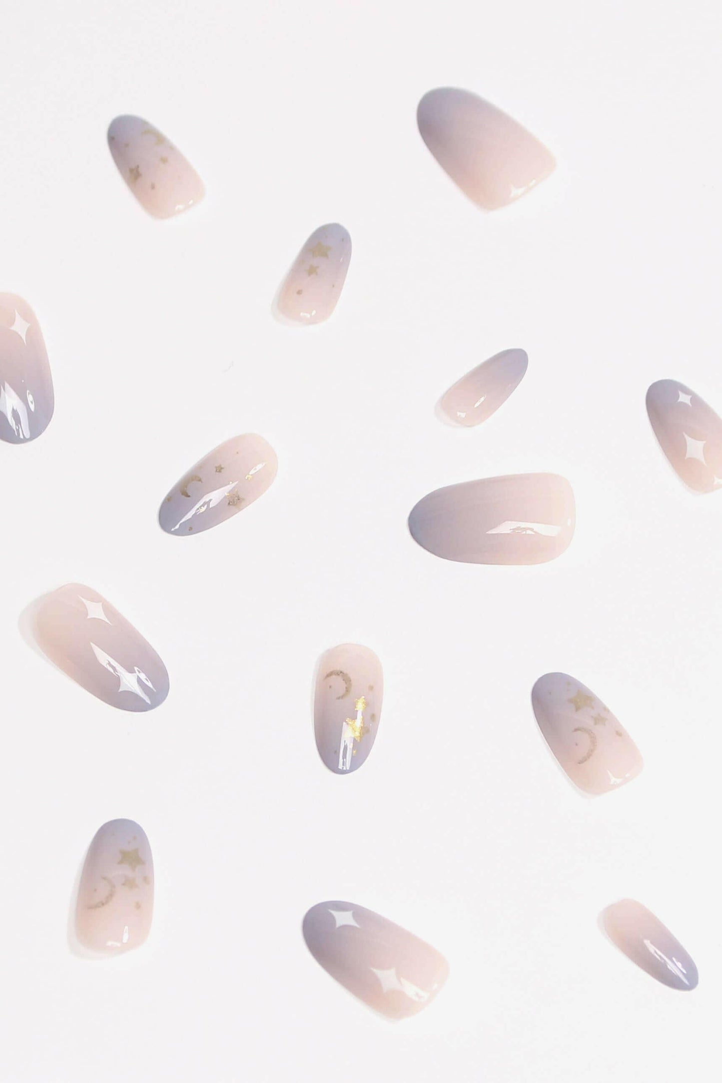 Drift into the tranquility of the early hours with Sky At Dawn press-on nails, adorned with gold celestial accents over a lavender-to-soft pink ombre. The gentle hues capture the serene promise of a new day, while the golden details add a whisper of dawn's first light.